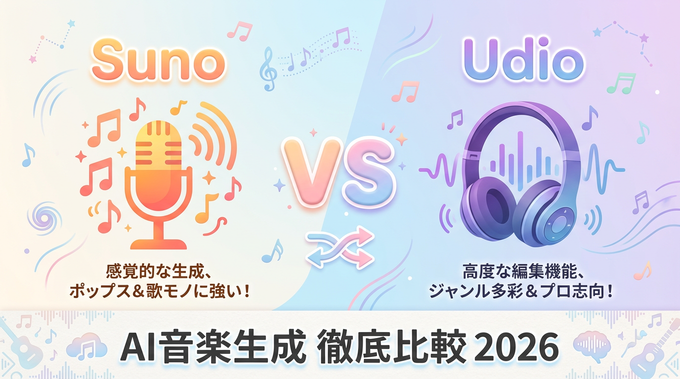 AI音楽生成ツールの2大巨頭、SunoとUdio。この記事では、両ツールを実際に触りながら、「本当に使えるのか」「どんな曲ができるのか」「著作権は大丈夫なのか」を検証していく。